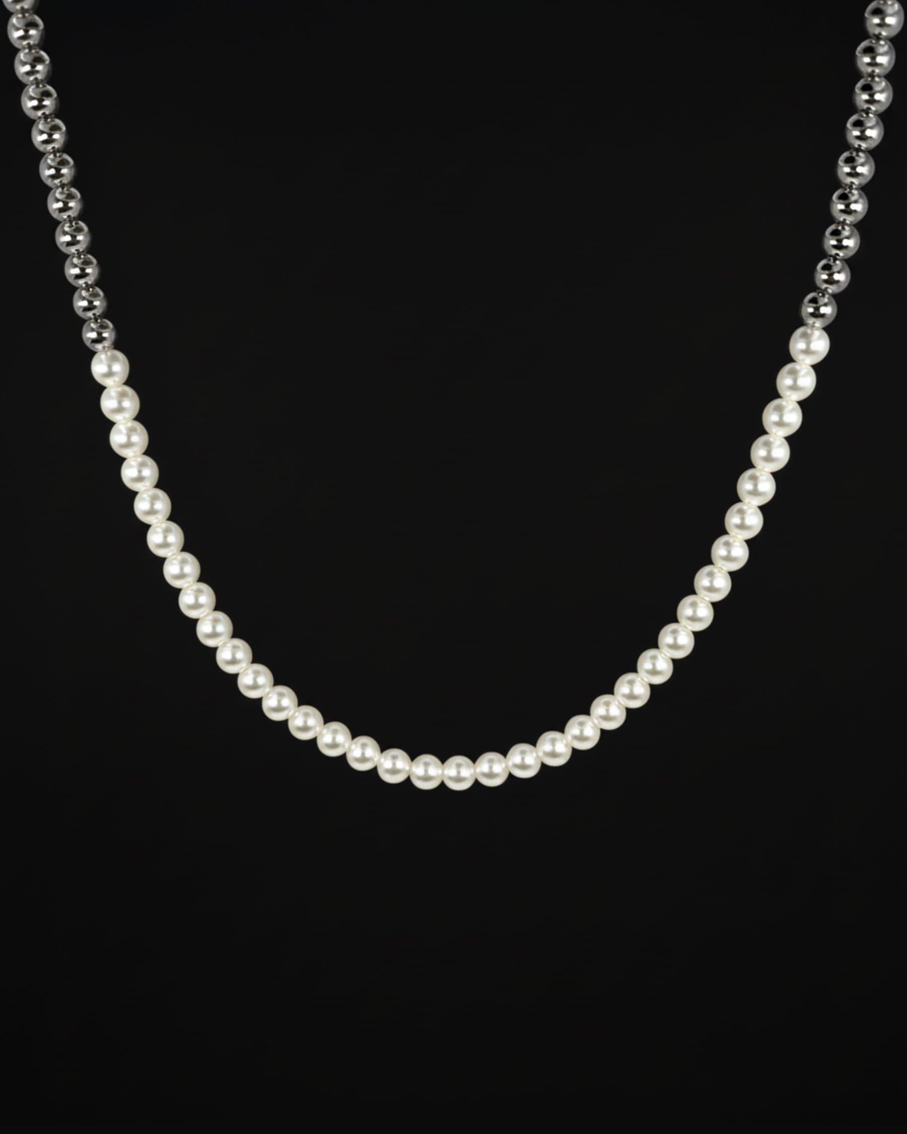 Kette aus hochwertigen Edelstahlperlen und synthetischen Perlen. Die Kette hat einen massiven Karabiner-Schließe aus Edelstahl.